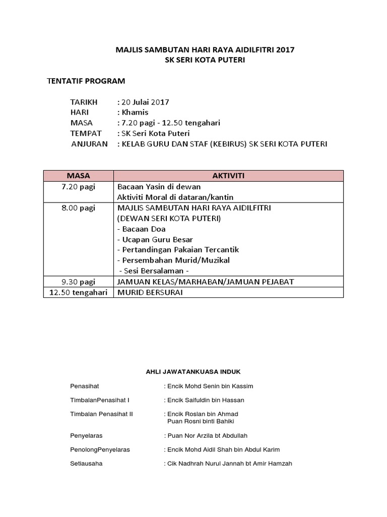 Kertas Kerja Majlis Sambutan Hari Raya Skskp 2017 Pdf
