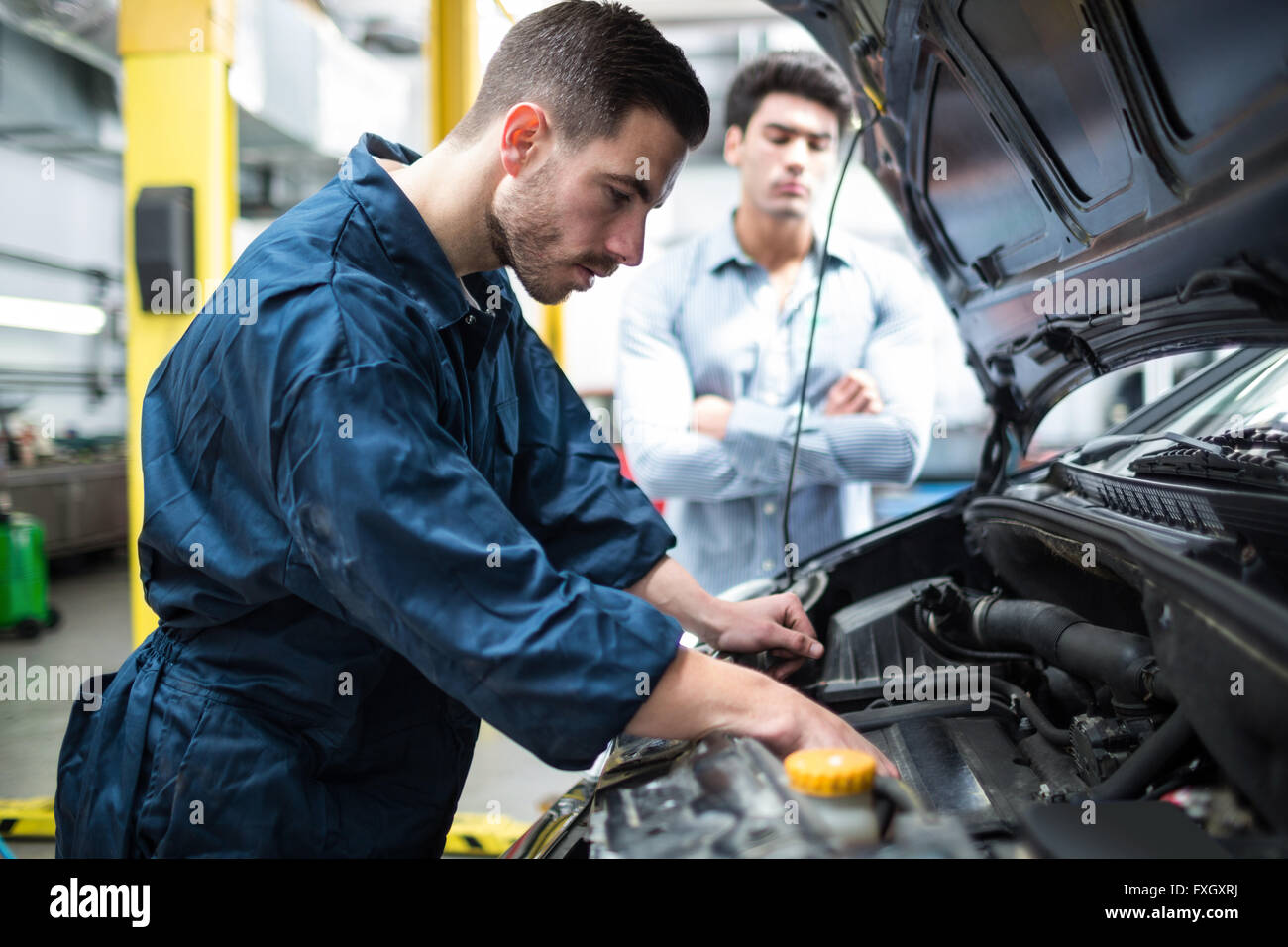 Mechanic Examining Car Engine While Customer Standing And Looking Stock Photo Alamy