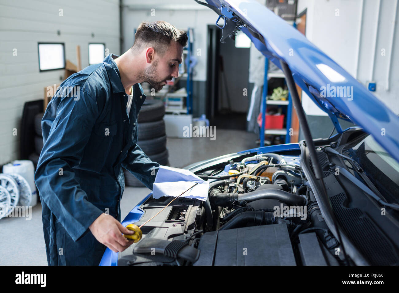 Mechanic Checking The Oil Level In A Car Engine Stock Photo Alamy